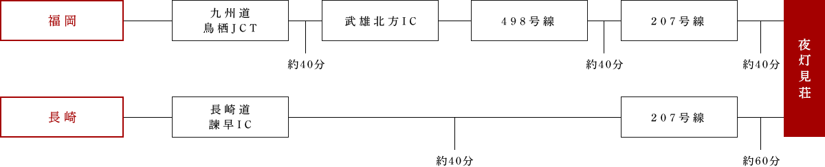 福岡から:九州自動車道径由長崎自動車道 → 武雄・北方IC → 国道498号線 → 207号線より40分。 「田古里の信号」を左折して5分で到着します。