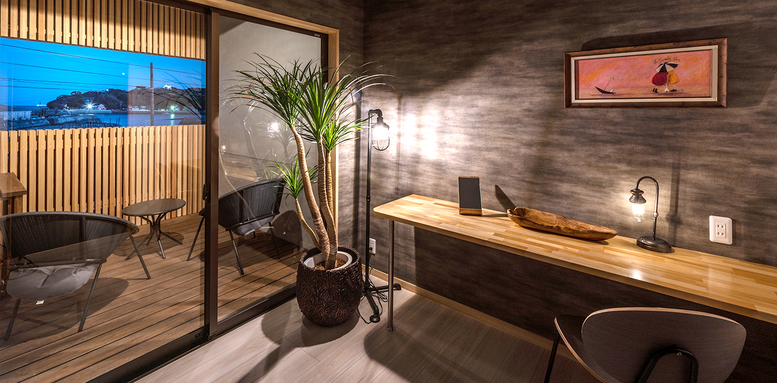 ベッドのある居住空間と、書斎(ワークスペース)とテラスのある客室。